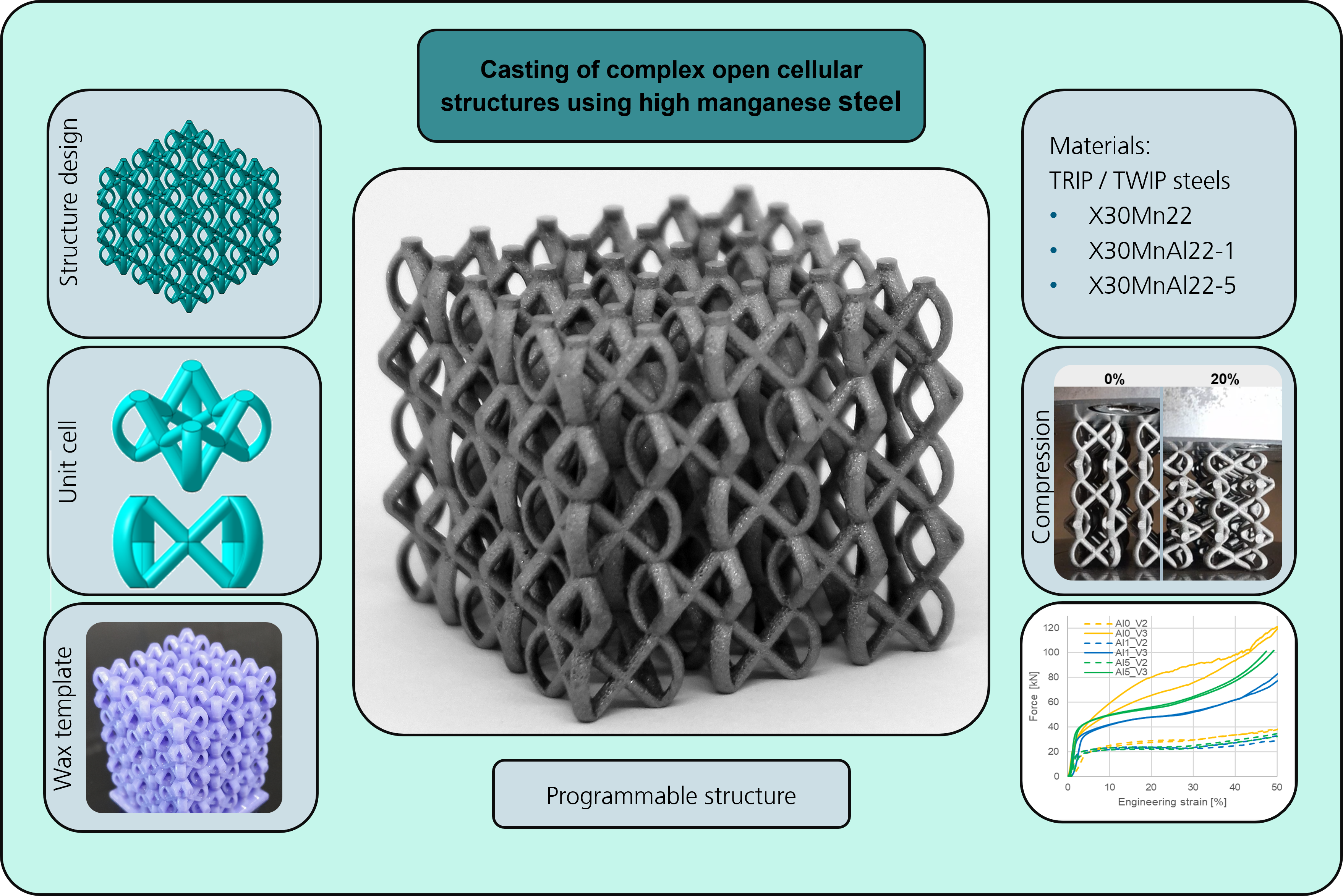 Casting of complex open cellular structures using high manganese steel